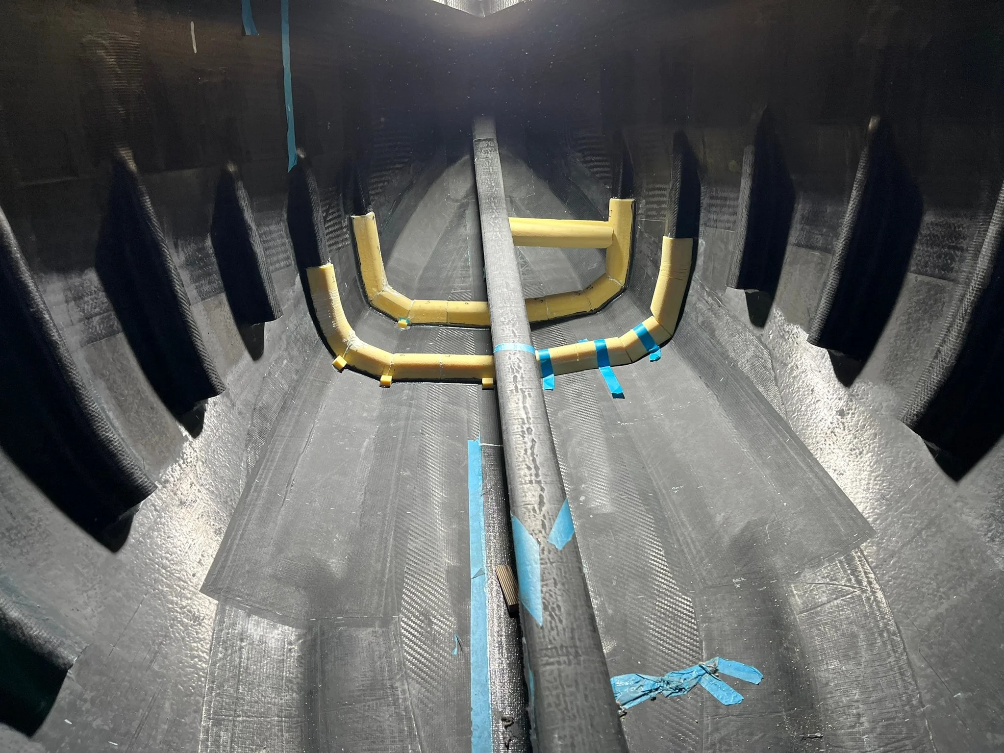 The new foils will be double the size of our last ones, capable of lifting double the weight, projecting the whole hull of Medallia clear of the water. They will be positioned further forward in the boat and naturally will exert different and greater forces on the hull so not only did we need to cover over the existing holes and then cut new ones in the topsides, but we have had to stiffen and strengthen the forward part of Medallia, by adding extra ribs and a full bulkhead (internal wall which bridges across the boat internally to support all deck and hull). All this work is being done by Carrington’s boat builders, who are the premier grand prix boat builders in the UK, with international reputation. The work is specialist, every piece of structure must be properly made, using carbon and epoxy. Individual parts are ‘cooked’ in autoclaves to cure the epoxy, then added to the boat in sequence. The working areas are cramped and the lighting is difficult. This type of work can be dusty, messy and needs to be precise. A rib in the wrong position or badly bonded to the hull, could be dangerous for me at sea, alone. Too much material than required will add weight and affect performance. Having tried my own lamination when things are broken, I can vouch how hard it is to get any sort of decent finish so when I go onto the boat each week and see the beautiful, precise finish of the boat builders at Carrington’s I know I am looking at incredible skill in action. Walking into their yard is not dusty or dirty, the environment it is as clean as a kitchen and every tiny detail matters.